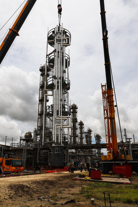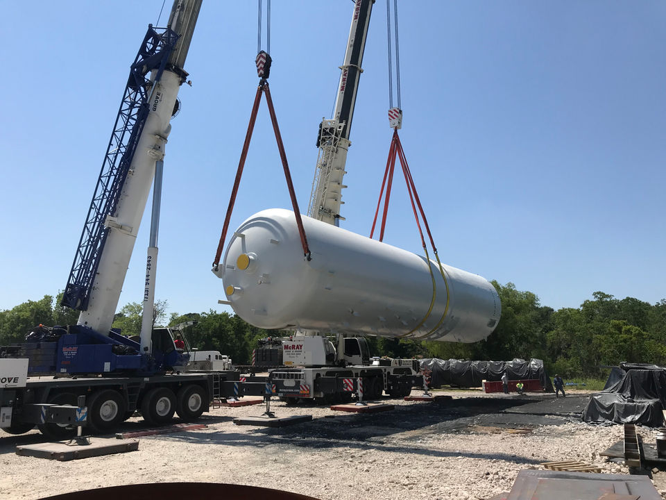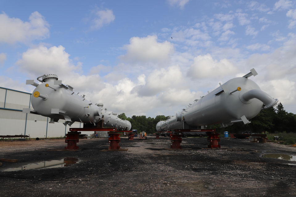 GCAW's delivery of two fully dressed process columns. At the time of shipment, both columns had the insulation installed, fireproofing applied. All downcomer piping was installed, heat traced, and insulated. Ladders and platforms were galvanized and attached. All valves were installed, including insulation blankets. All internals were installed.