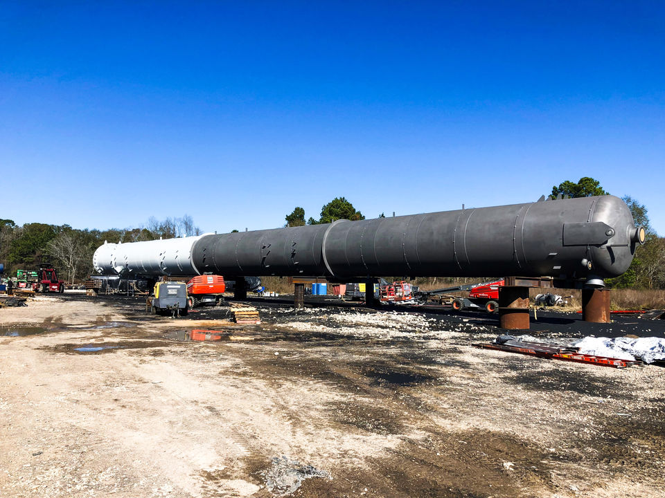 A critical path process column fabricated on an expedited delivery for an oil refinery. The column was fabricated in 78 days and dressed out with TSA (Thermal Spray Aluminum), Insulation, Intumescent Fireproofing, and Tray Installation in less than 40 days.